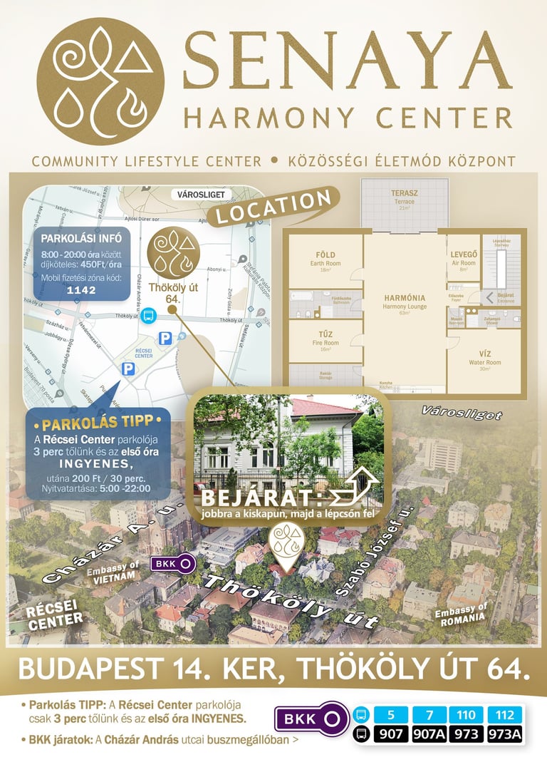A Senaya Harmony Center egy elegáns villaépületben található Budapest XIV. kerületében, a Keleti pályaudvar és a Puskás Aréna között, a Városliget szomszédságában - jól megközelíthető, mégis nyugodt környezetben.